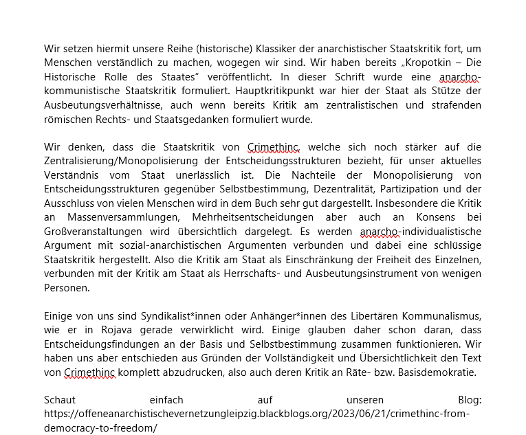Wir denken, dass die Staatskritik von Crimethinc, welche sich noch stärker auf die Zentralisierung/Monopolisierung der Entscheidungsstrukturen bezieht, für unser aktuelles Verständnis vom Staat unerlässlich ist. Die Nachteile der Monopolisierung von Entscheidungsstrukturen gegenüber Selbstbestimmung, Dezentralität, Partizipation und der Ausschluss von vielen Menschen wird in dem Buch sehr gut dargestellt. Insbesondere die Kritik an Massenversammlungen, Mehrheitsentscheidungen aber auch an Konsens bei Großveranstaltungen wird übersichtlich dargelegt. Es werden anarcho-individualistische Argument mit sozial-anarchistischen Argumenten verbunden und dabei eine schlüssige Staatskritik hergestellt. Also die Kritik am Staat als Einschränkung der Freiheit des Einzelnen, verbunden mit der Kritik am Staat als Herrschafts- und Ausbeutungsinstrument von wenigen Personen.